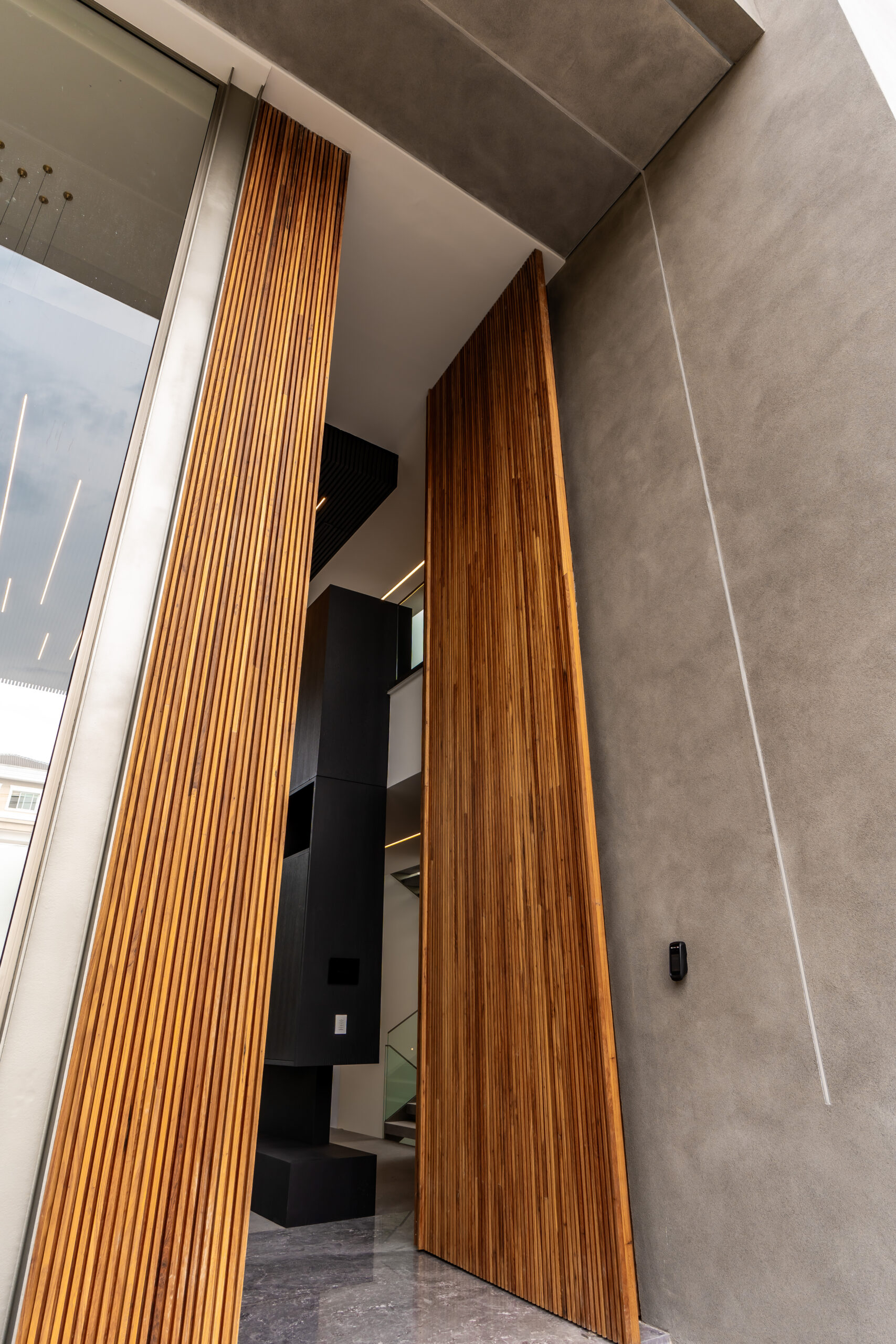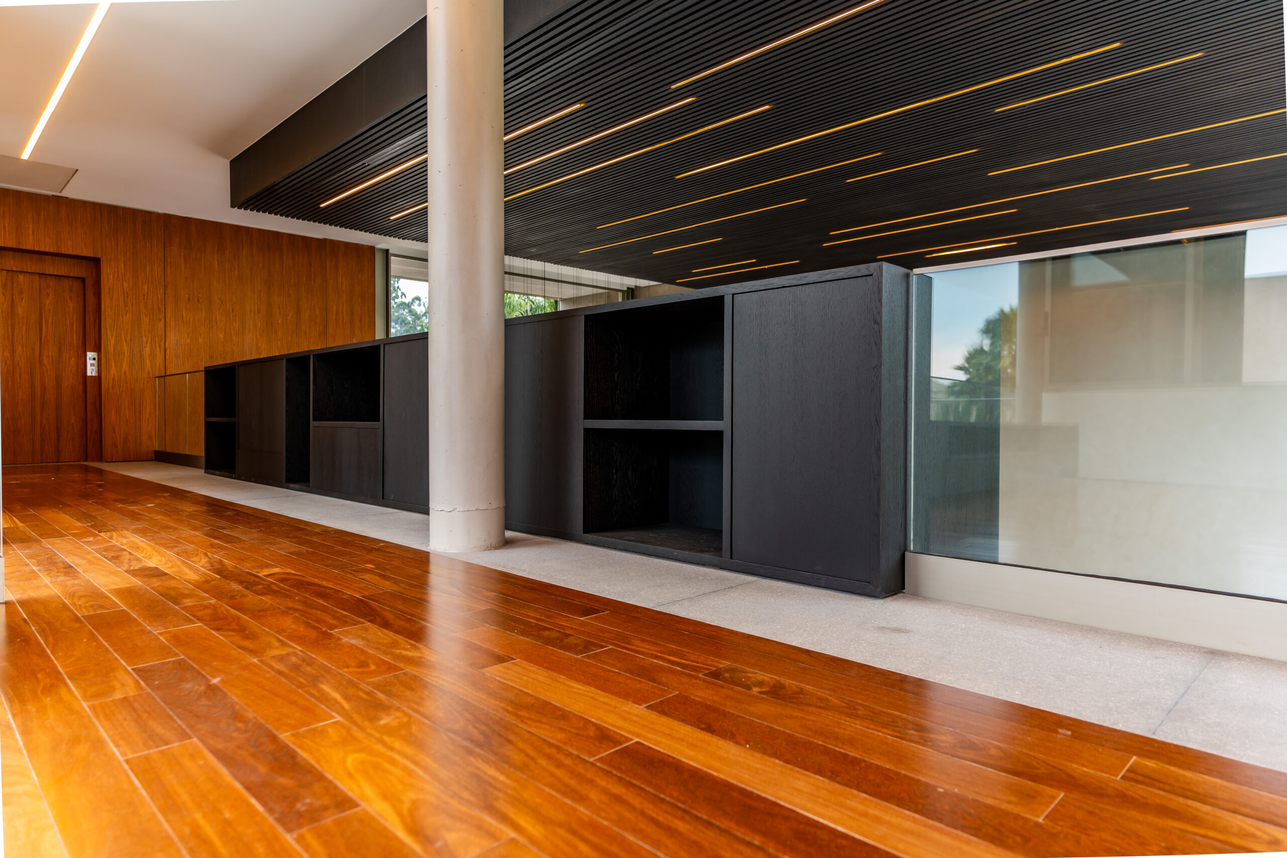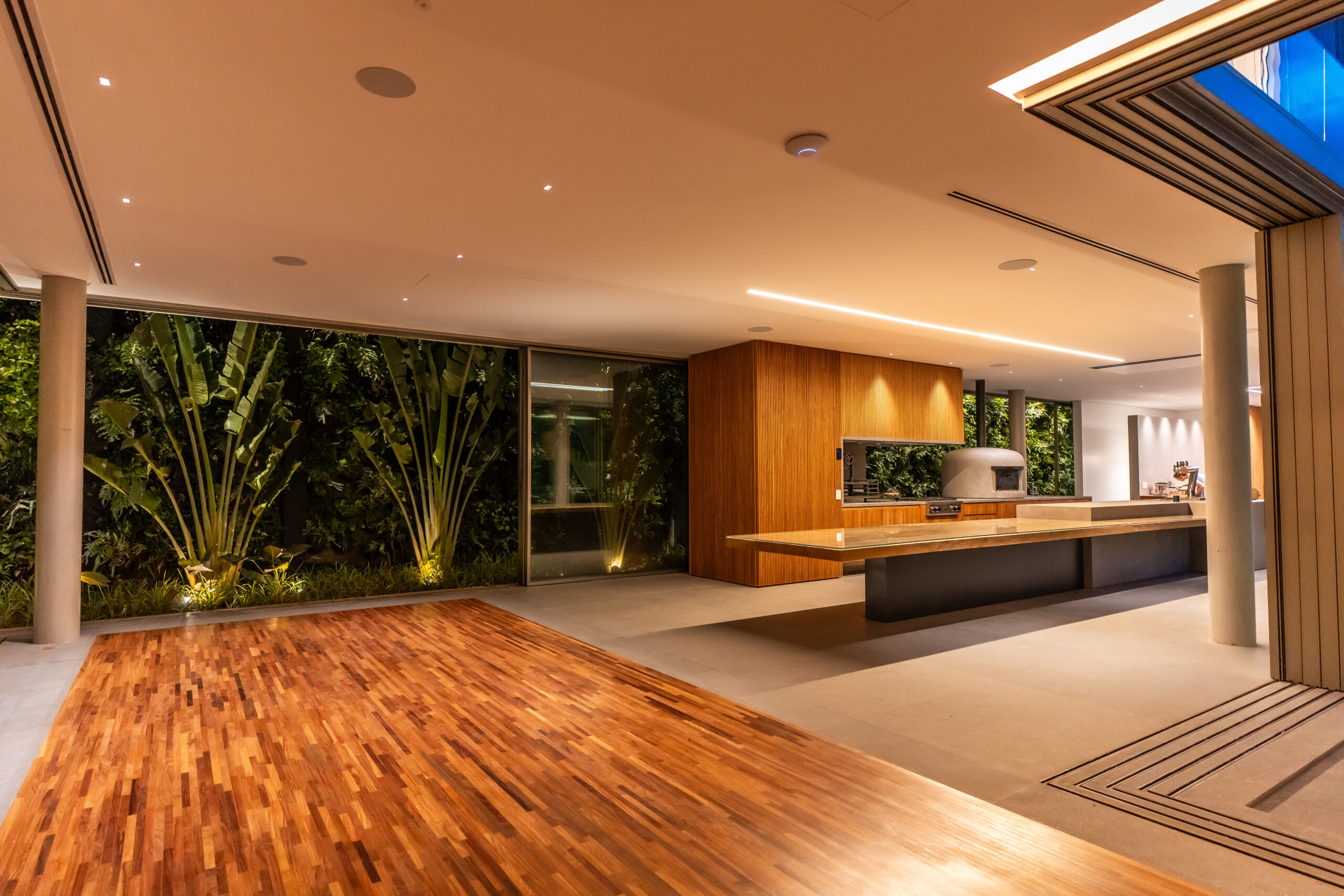 O grande living é feito com marcenaria de pé direito duplo, teto artesanal em madeira ébano e com as grandes portas em serralheria sob medida moldadas em peças únicas. A proposta do living é a de ser um local nobre e sofisticado para uma recepção marcante.