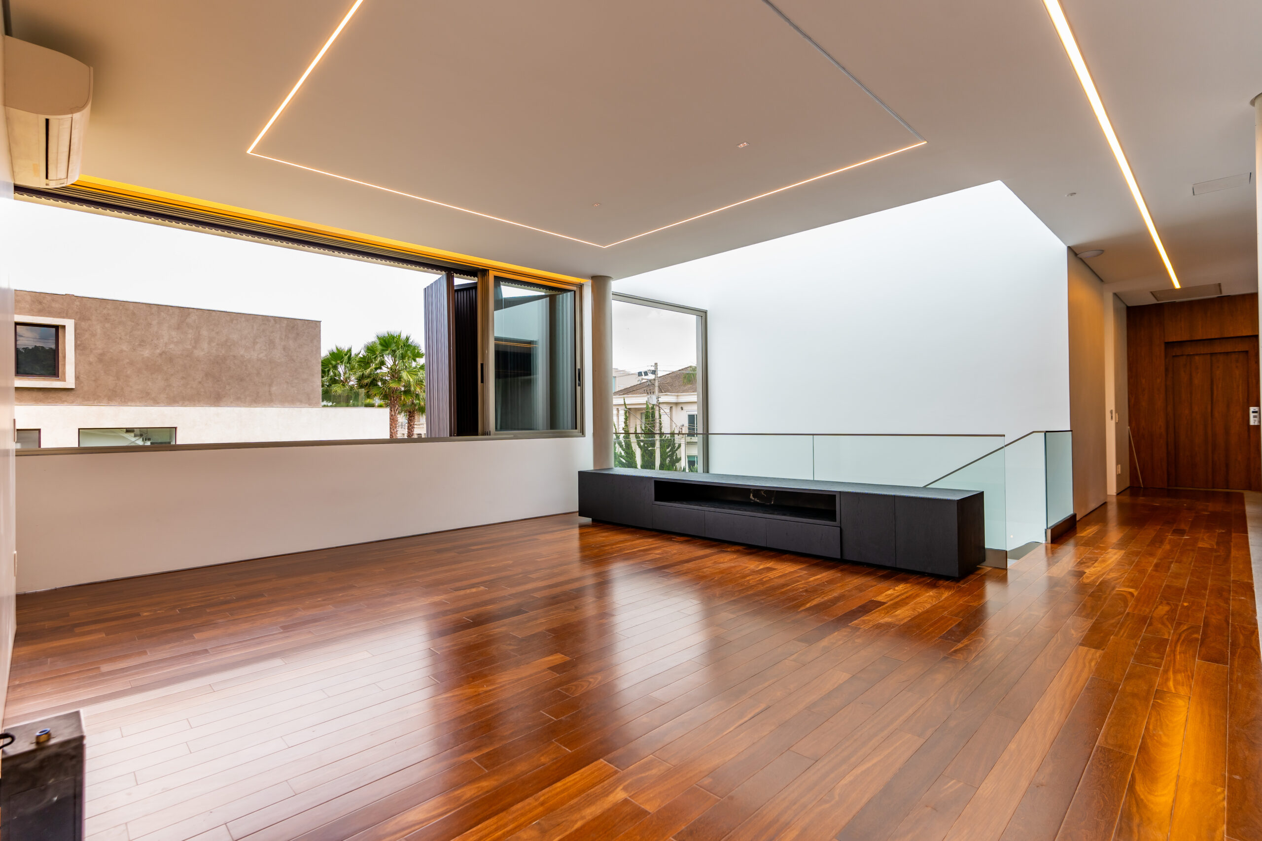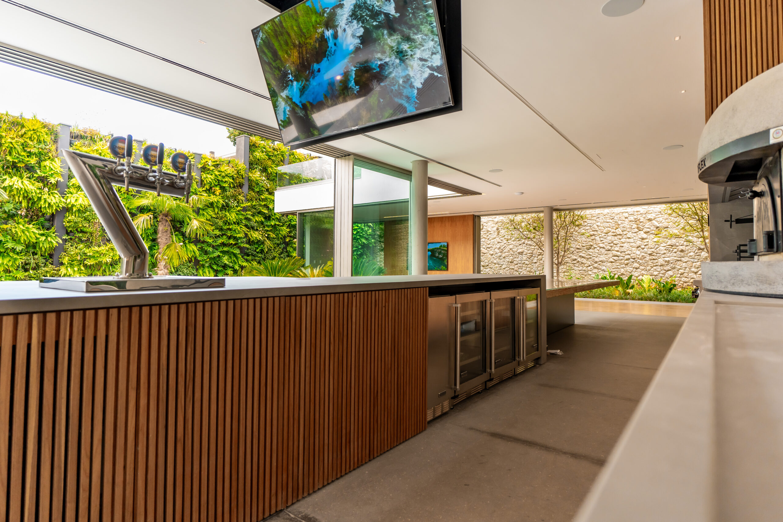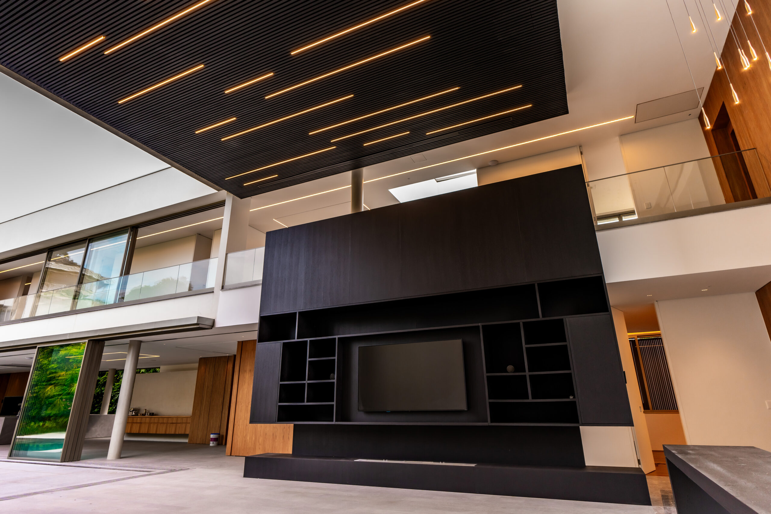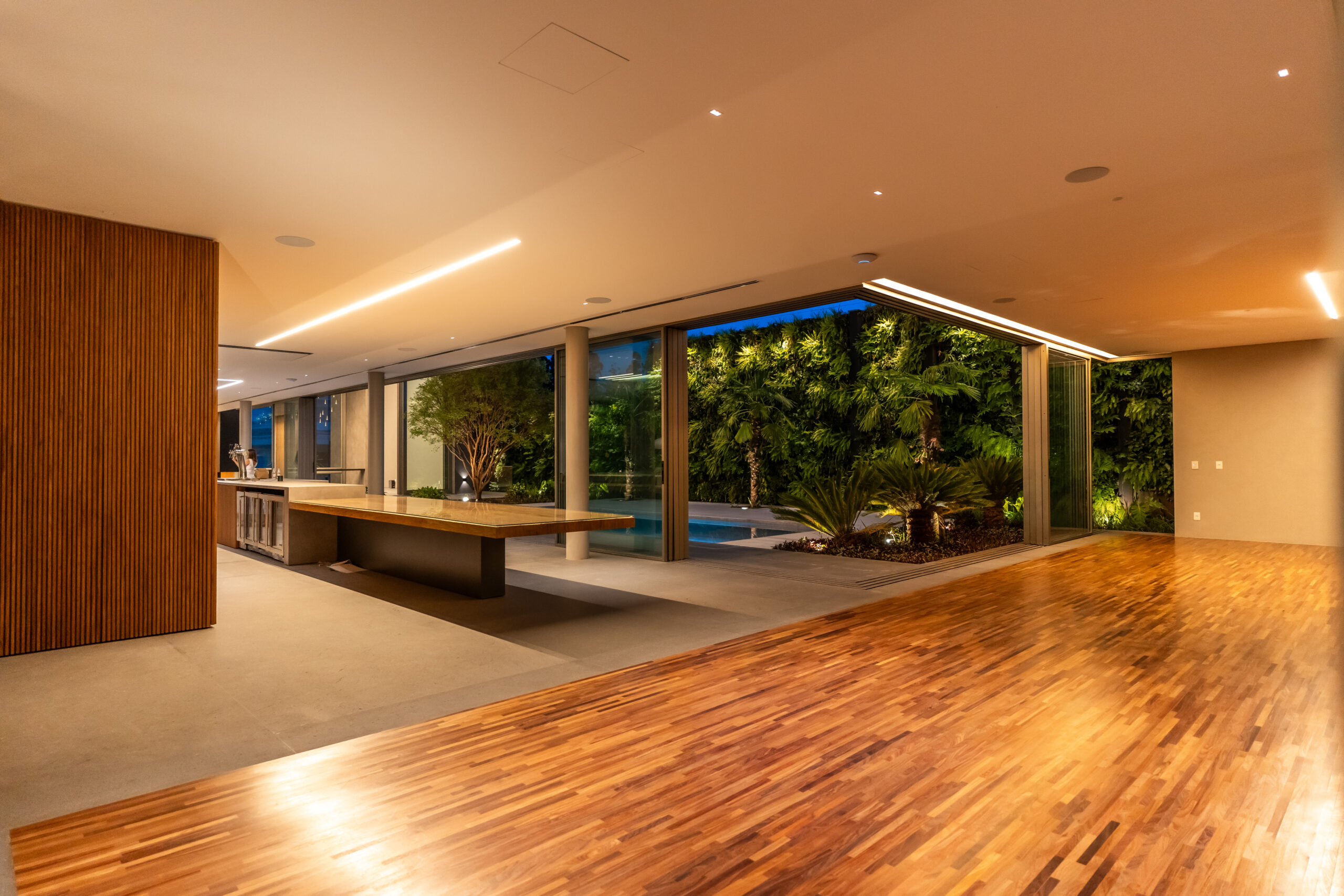 O grande living é feito com marcenaria de pé direito duplo, teto artesanal em madeira ébano e com as grandes portas em serralheria sob medida moldadas em peças únicas. A proposta do living é a de ser um local nobre e sofisticado para uma recepção marcante.
