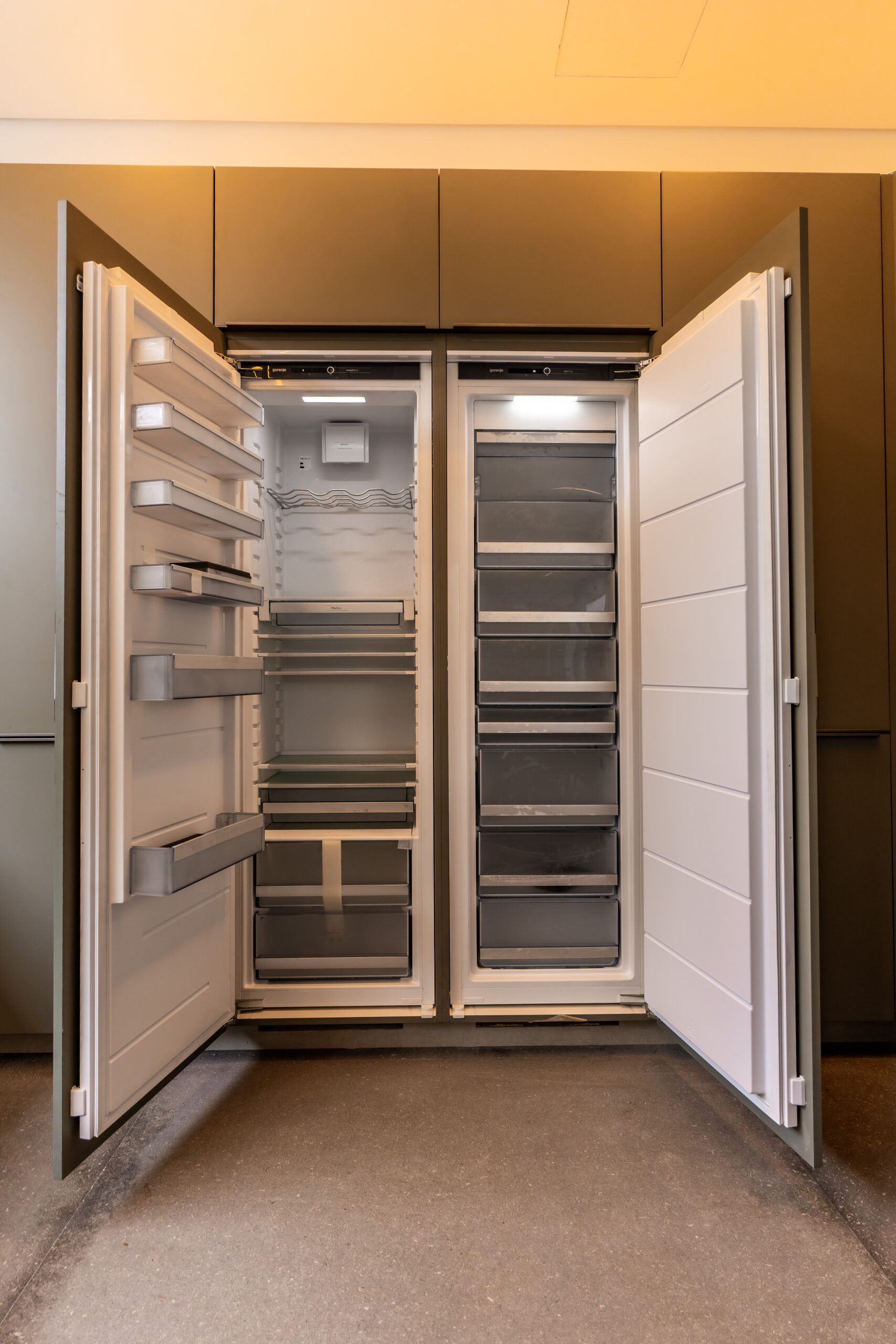 A cozinha além dos eletrodomésticos VIKING, é equipada as peças da GORENGE, com frente revestida que aparecem tanto nos refrigeradores quanto na lava-louça.