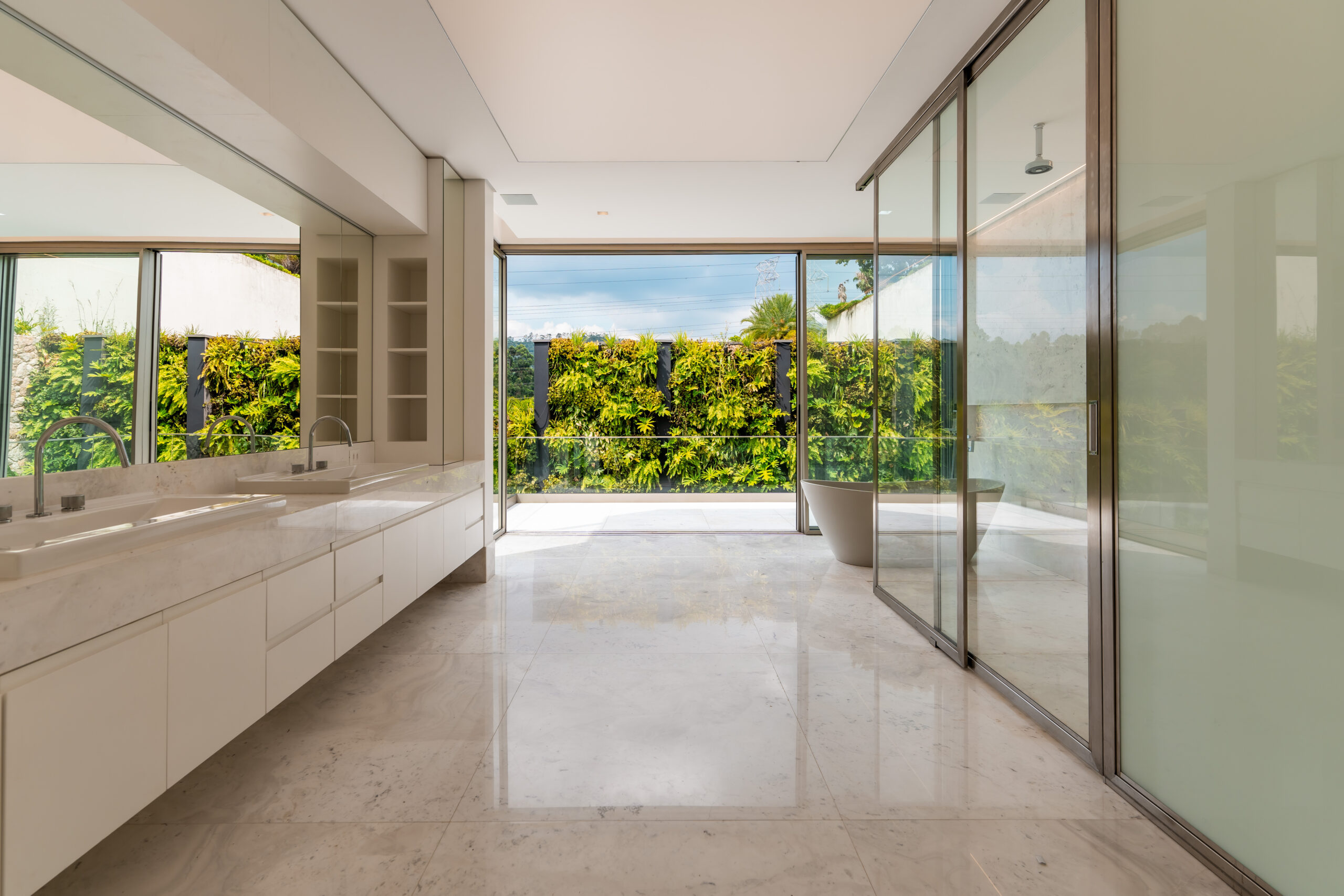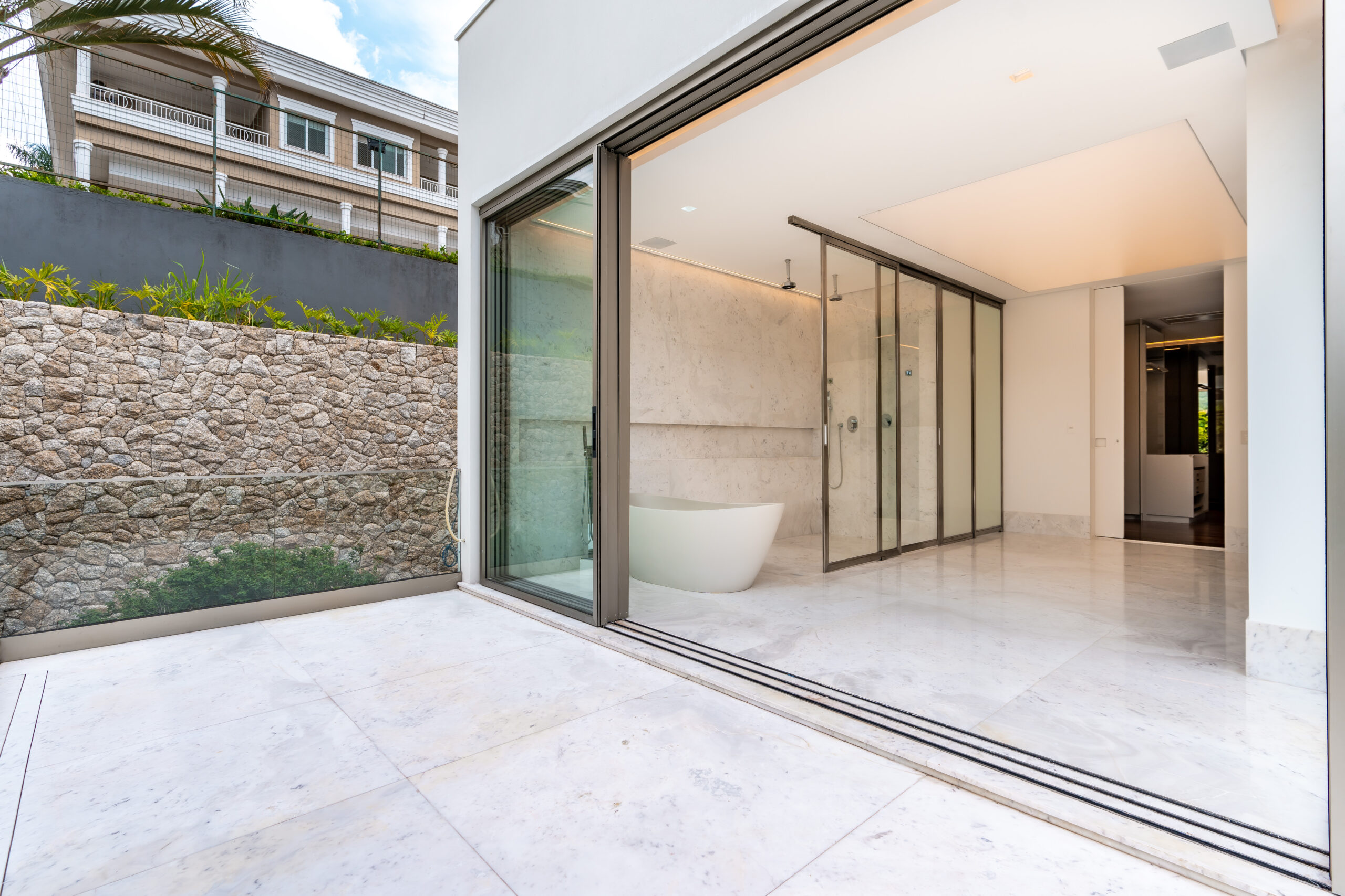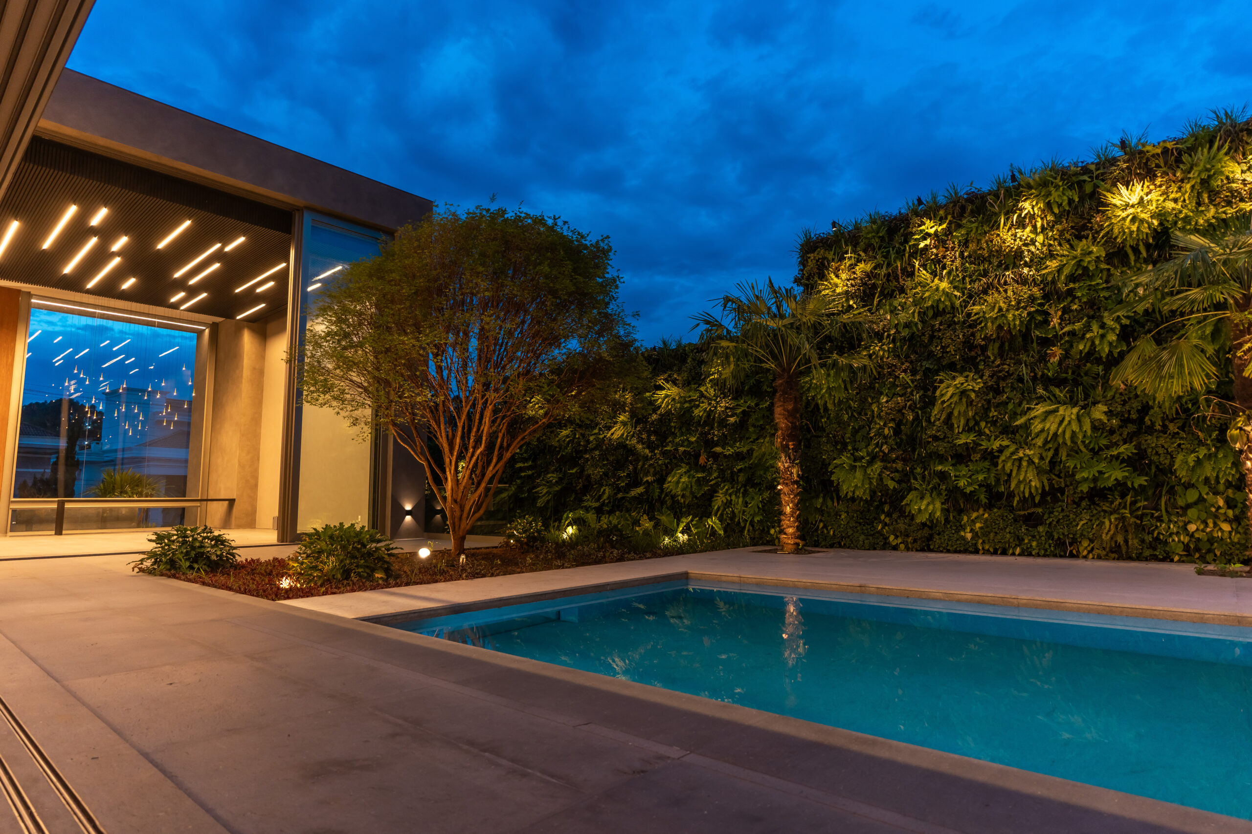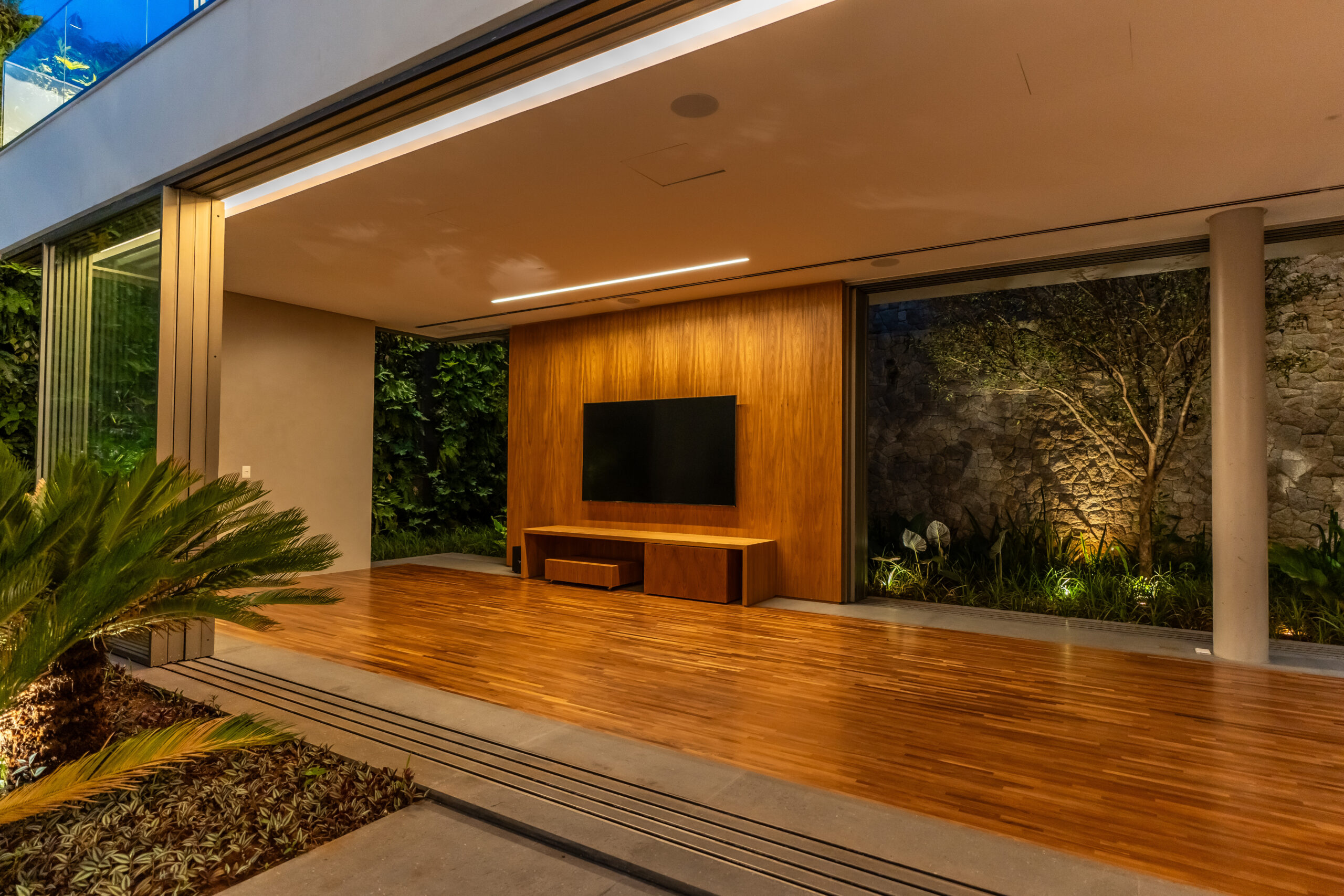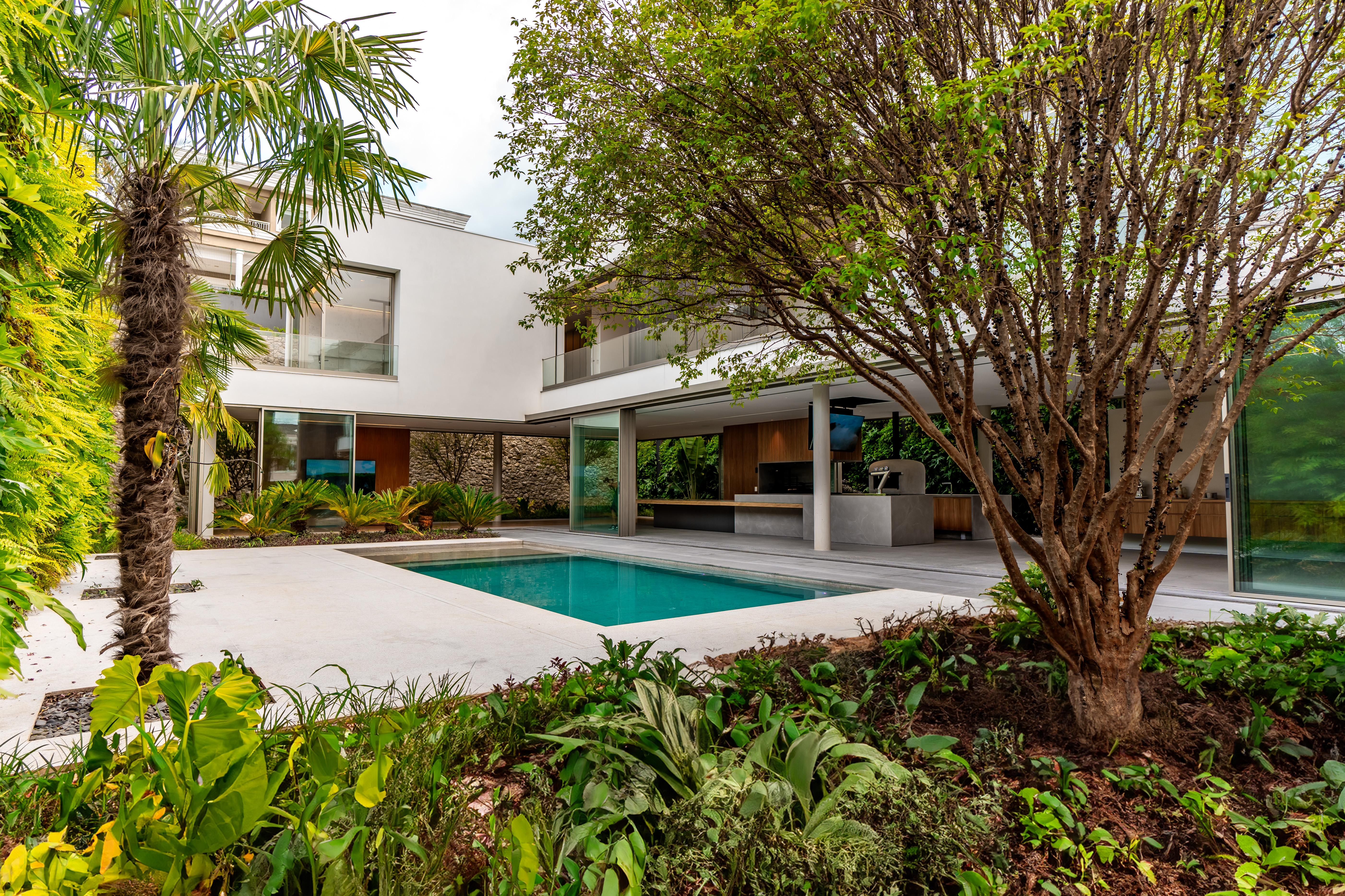 Projetado pelo renomado paisagista Marcelo Belloto, outro diferencial e grande destaque da Casa Oave é o jardim. Em forma de pateo, ocupa o centro da casa epercorre todo o seu perímetro, dando a volta e proporcionando contato com o jardim de todas as portas e janelas da casa.