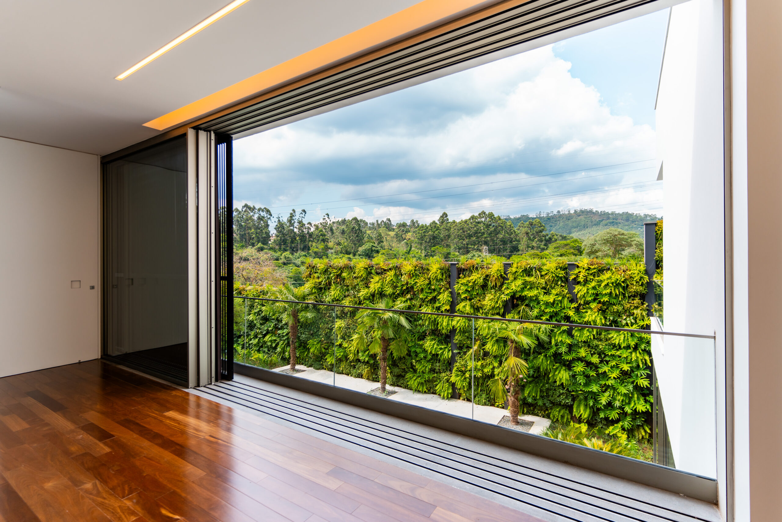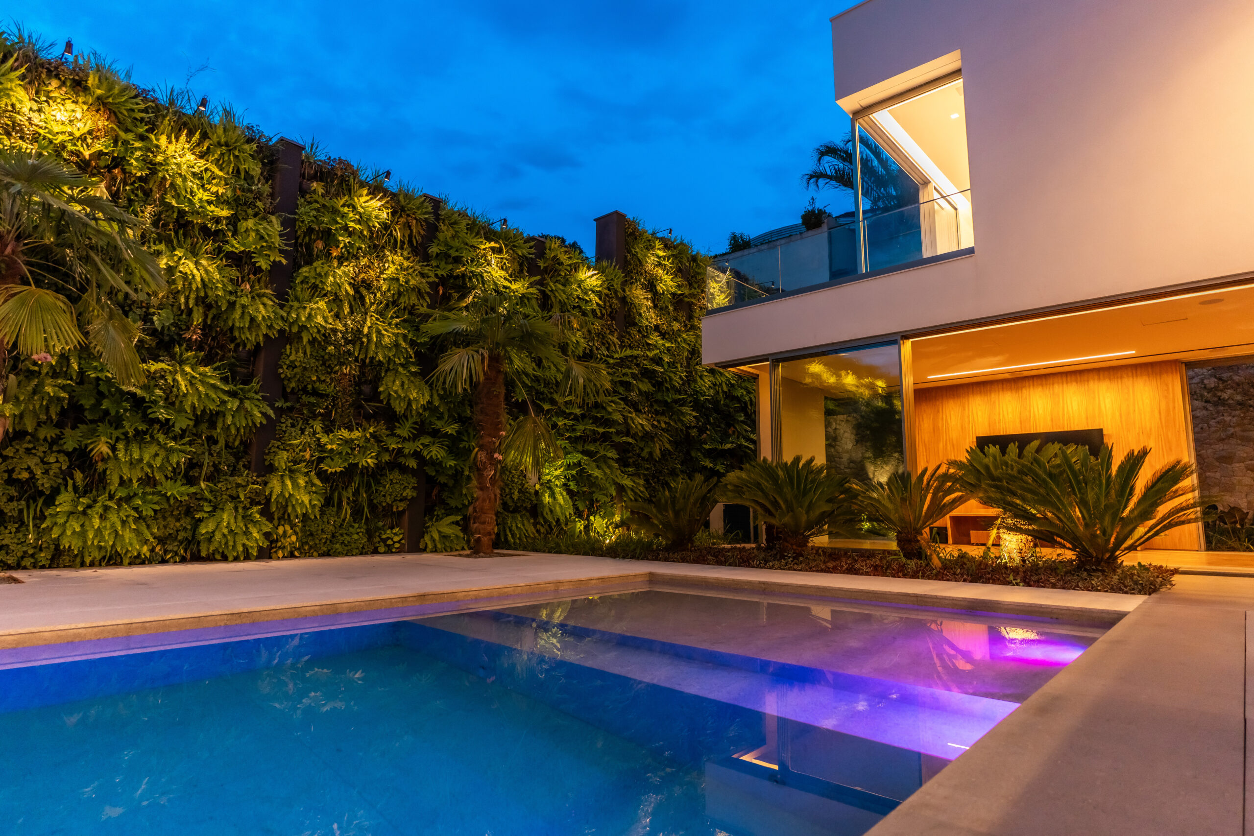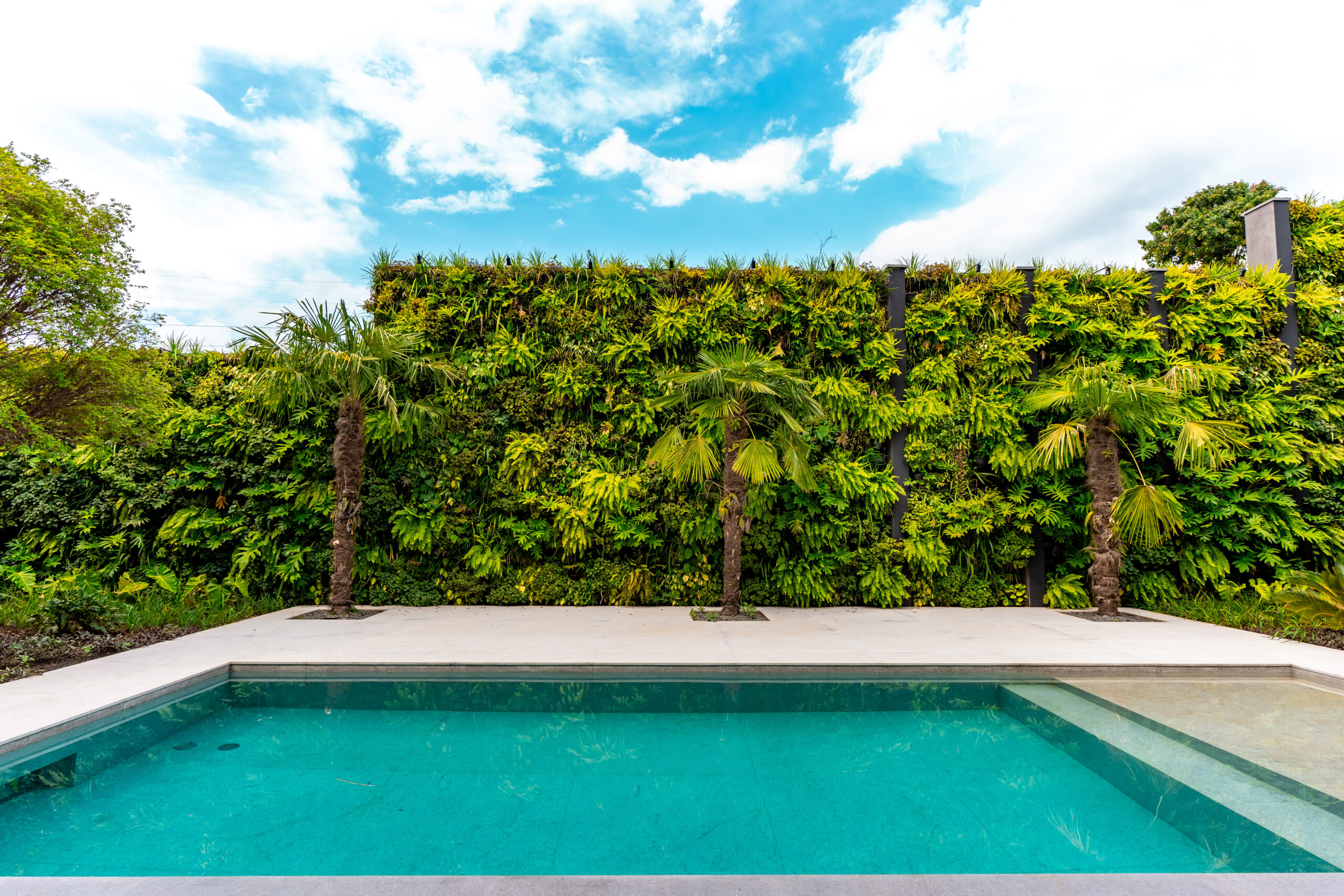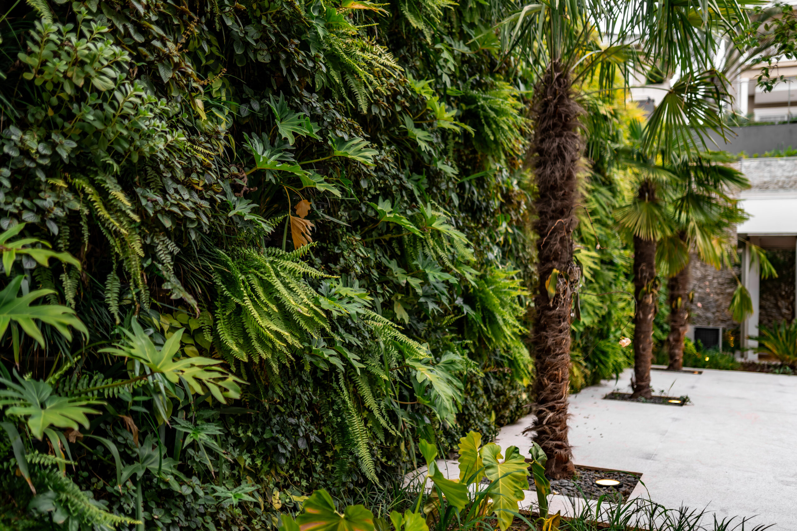 Um muro verde de 450 m2, mais de 5 mil vasos envolve a Casa Oave em um verde refrescante.