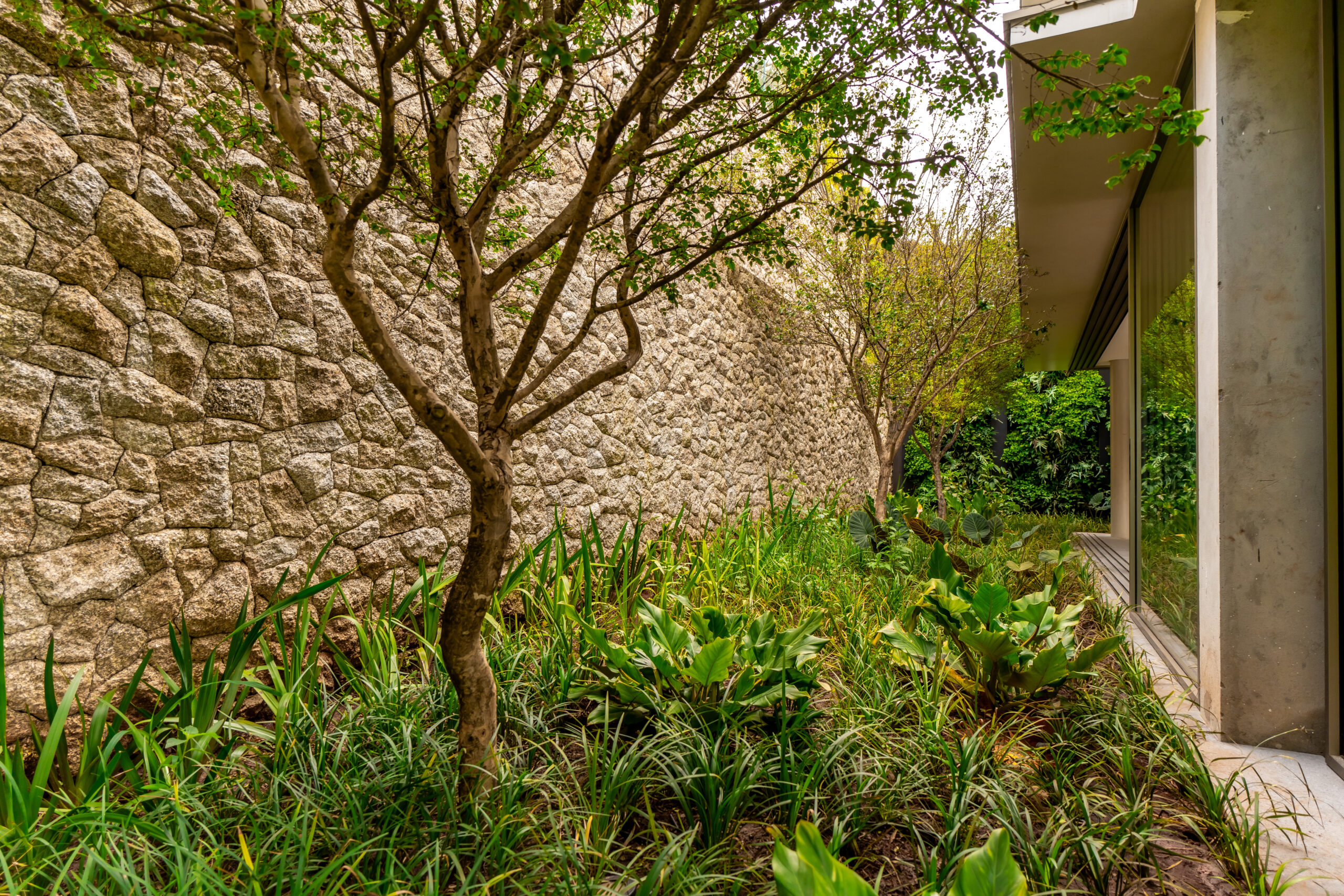 No hall externo, um volume de pedra surpreende com uma cascata de água derramando em todas as suas laterais. A rampa para a garagem lounge é ladeada por muro verde. O acesso de serviço lateral é dissimulando pela vegetação e pelos borders da fachada lateral.