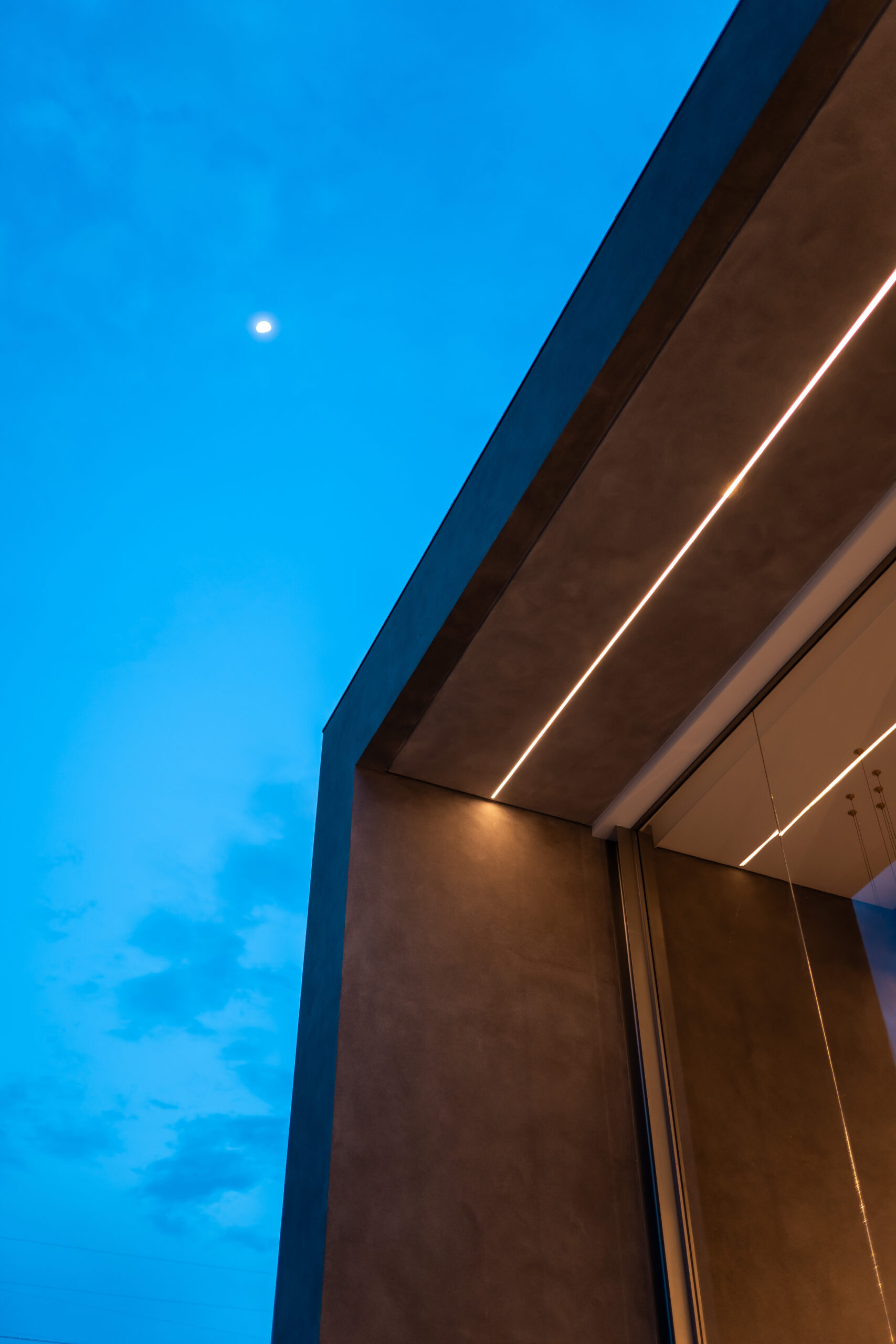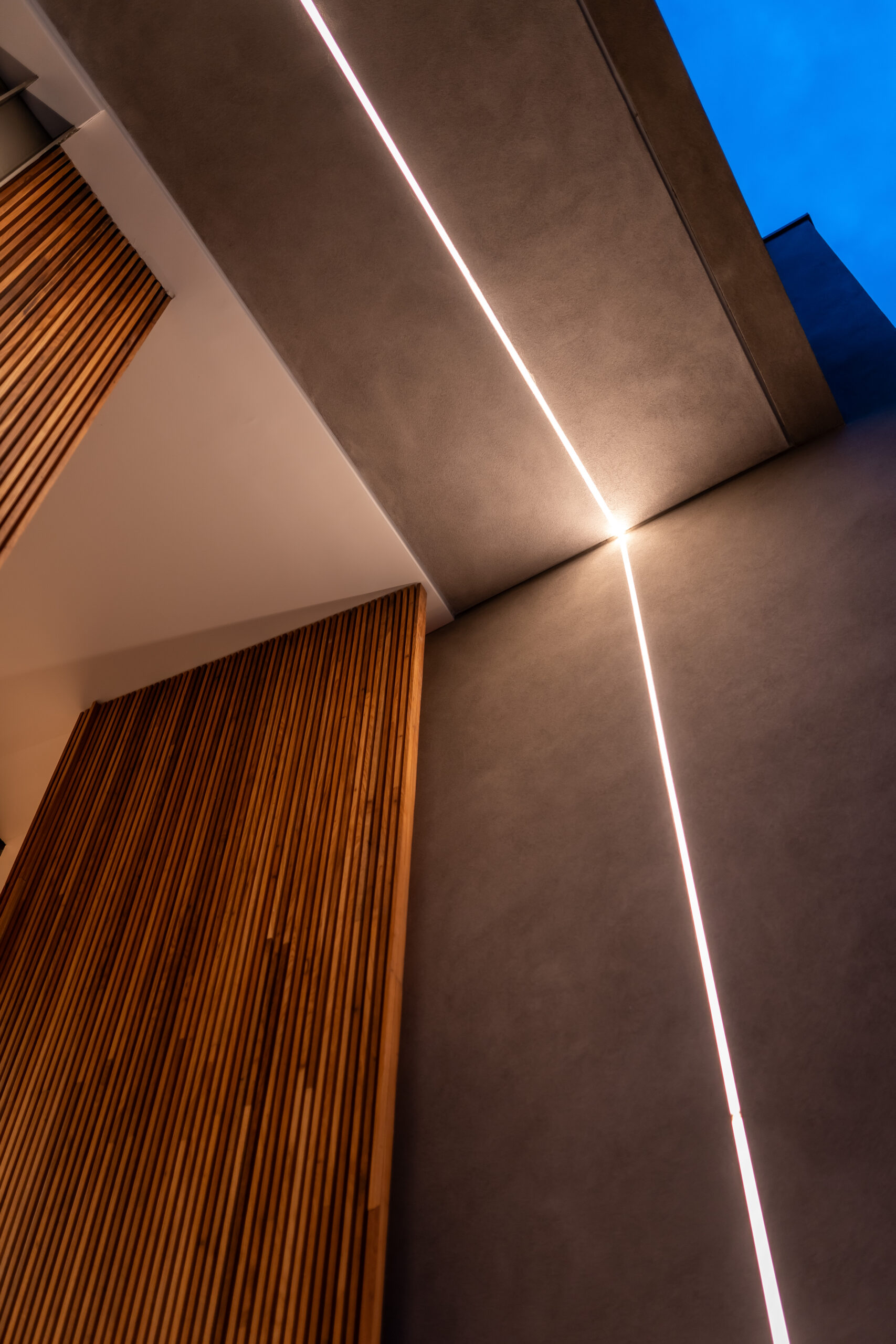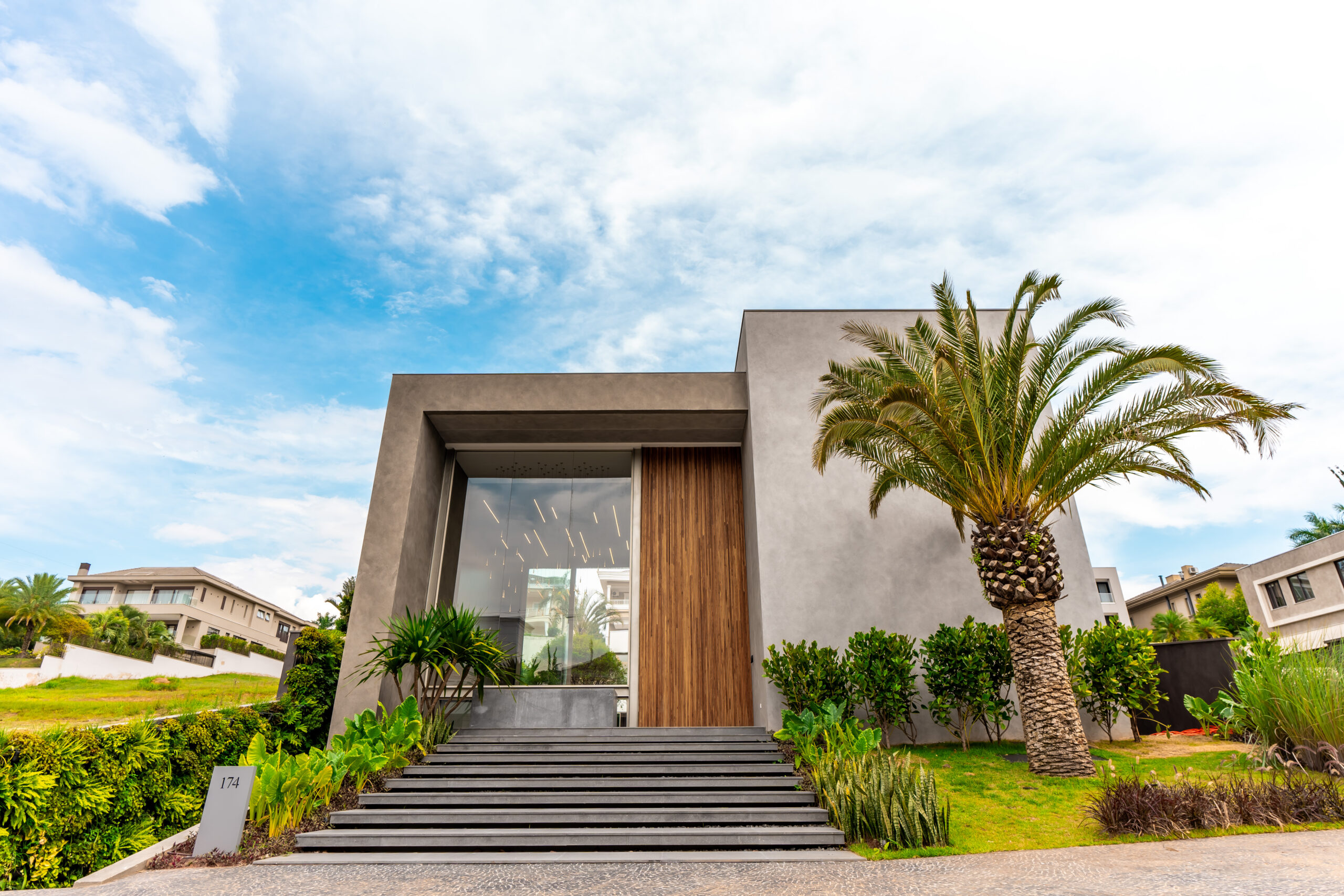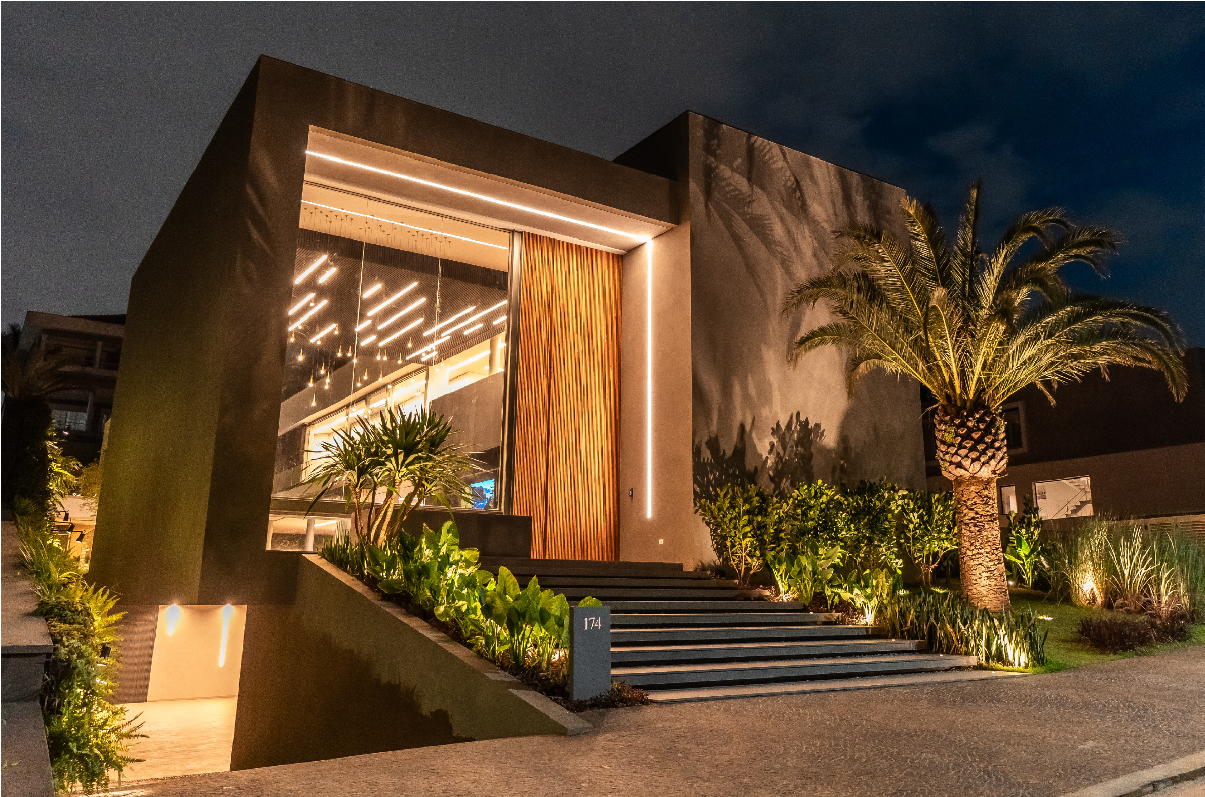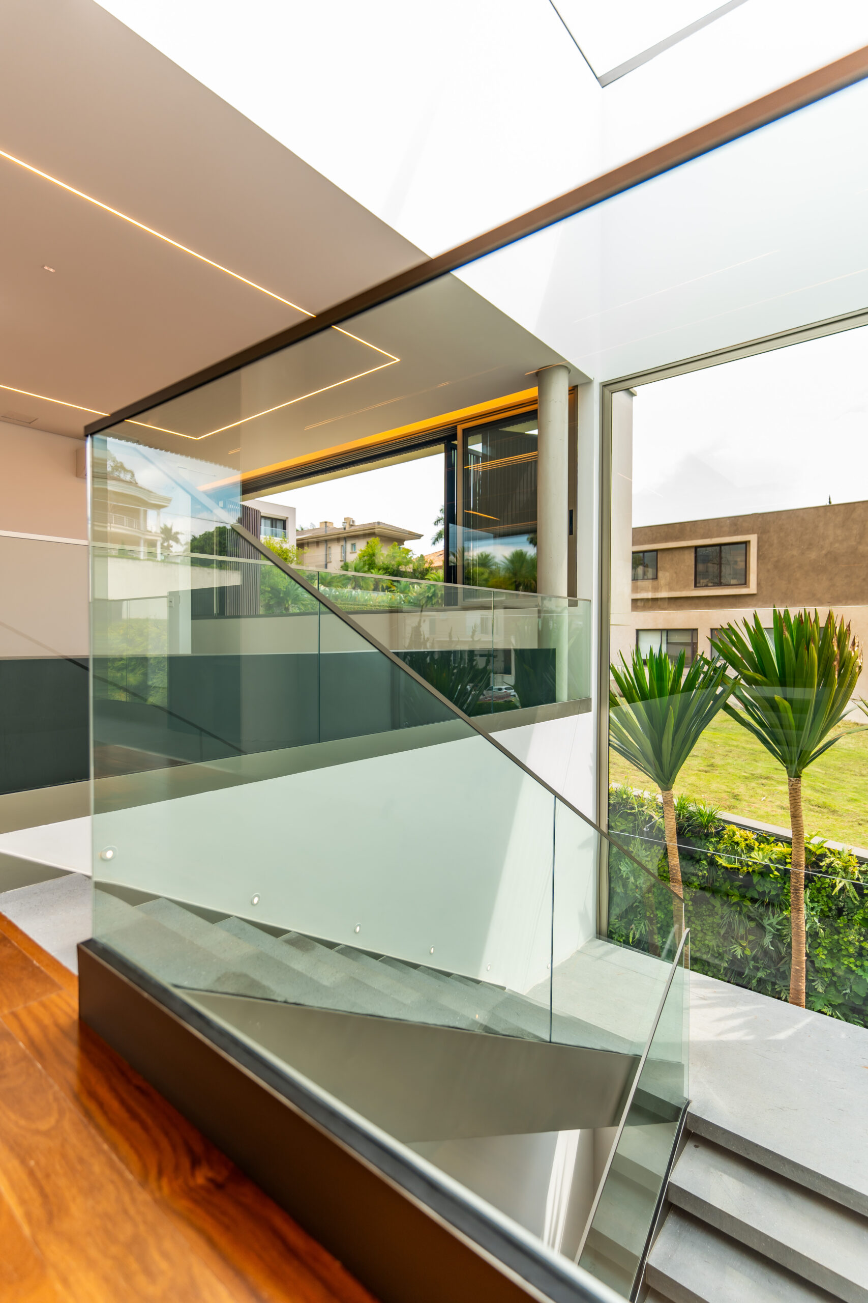 Um dos volumes possui fechamento em vidro que insinua o grande living de pé-direito duplo e que possui uma luminária diferenciada do designer brasileiro, Jader Almeida pendendo sobre o hall. Em frente deste volume envidraçado acontece um hall externo e a escadaria que o convida a entrar.