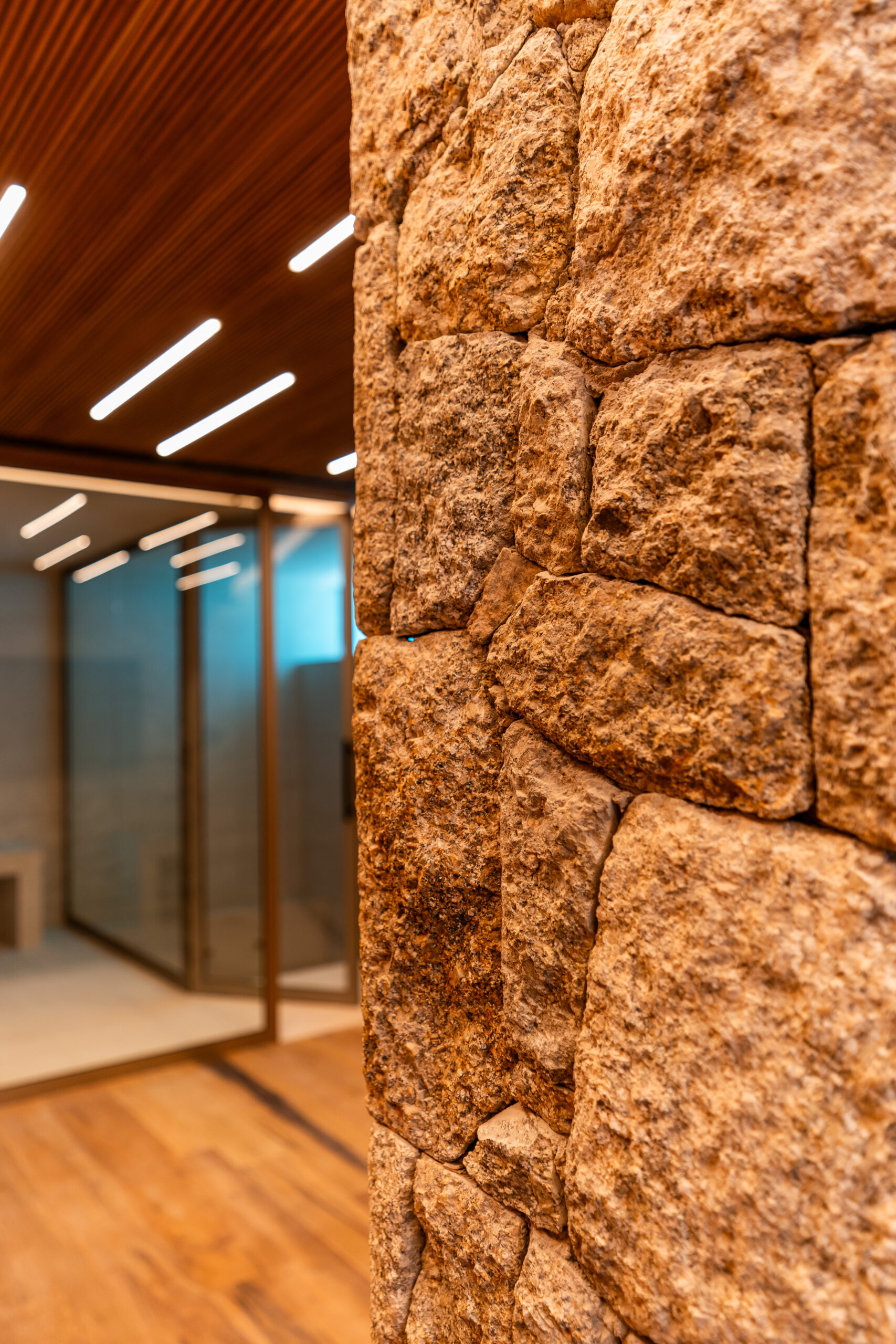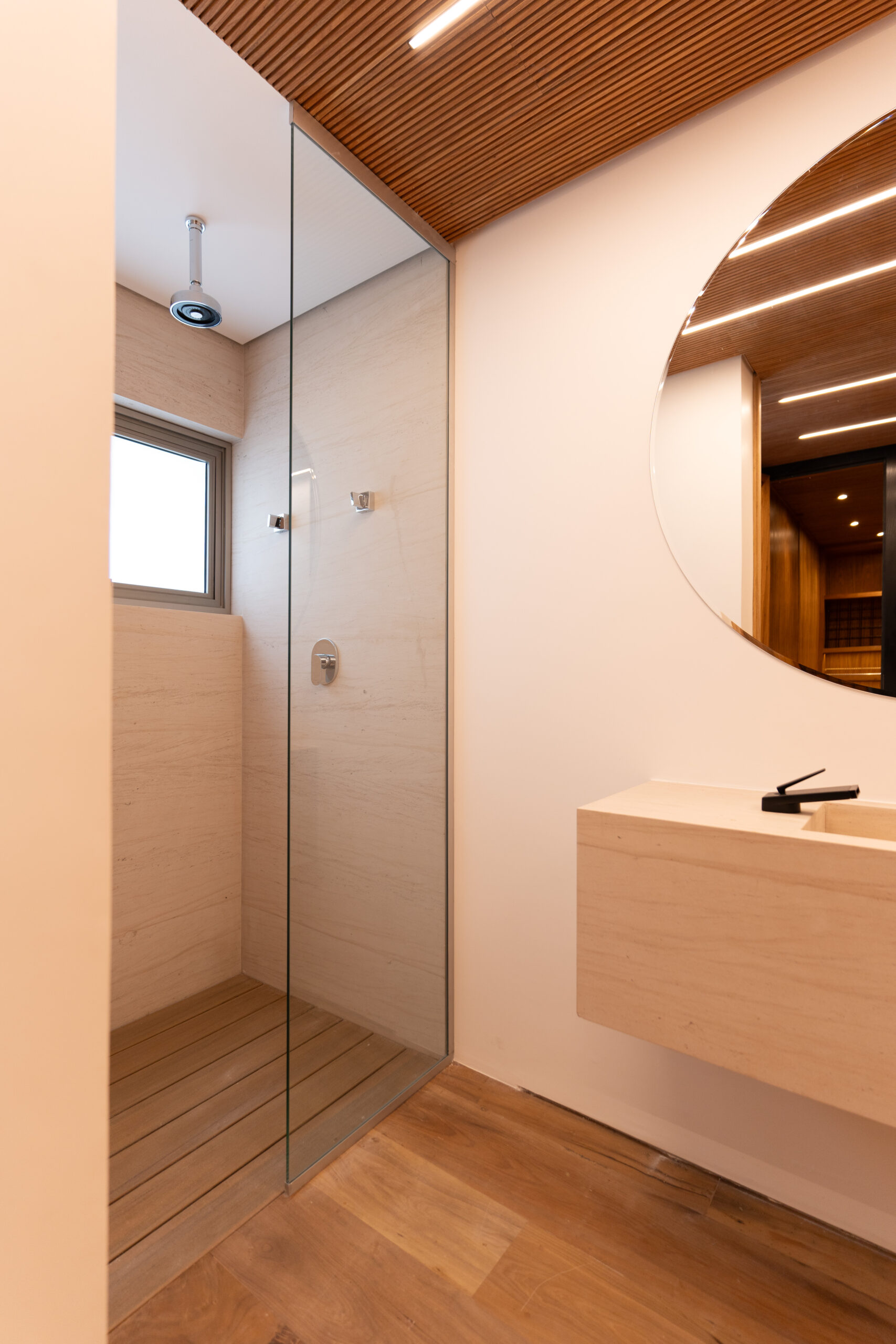 Todo o spa é revestido em madeira nobre, oferece um espaço relax para massagem e descanso, além da sauna e hidro revestidos de pedra italiana com vista da piscina e cascata.
