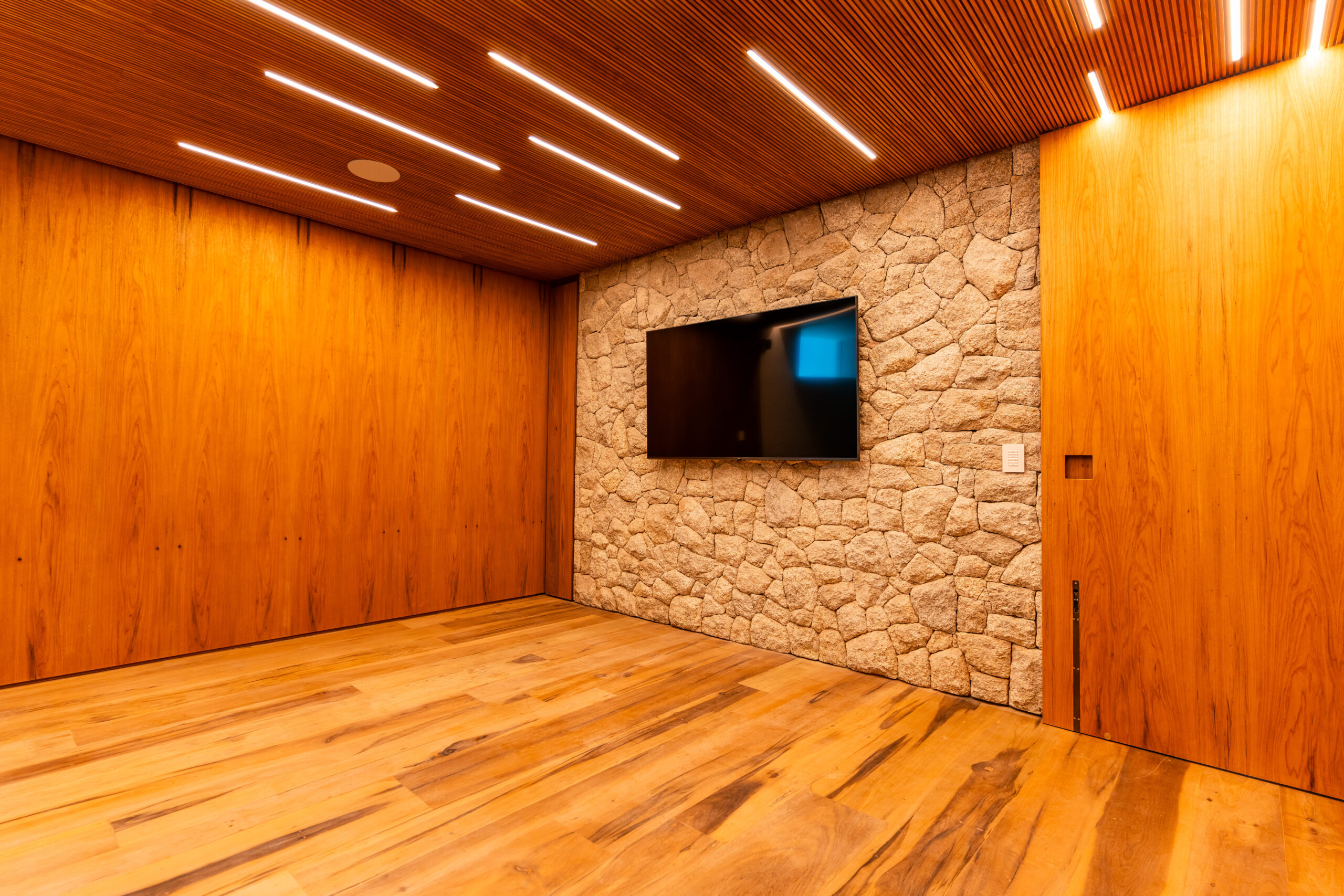 Do hall de chegada da garagem você tem acesso ao cinema da Casa Oave. Todo revestido em madeira e material acústico, o projeto de Home Cinema foi desenvolvido pela Rodrigues Automação. Além de contar com 13 poltronas da Casa de Cinema Brasil, referência em conforto e ergonomia, na elaboração de “Cinemas em Casa”.