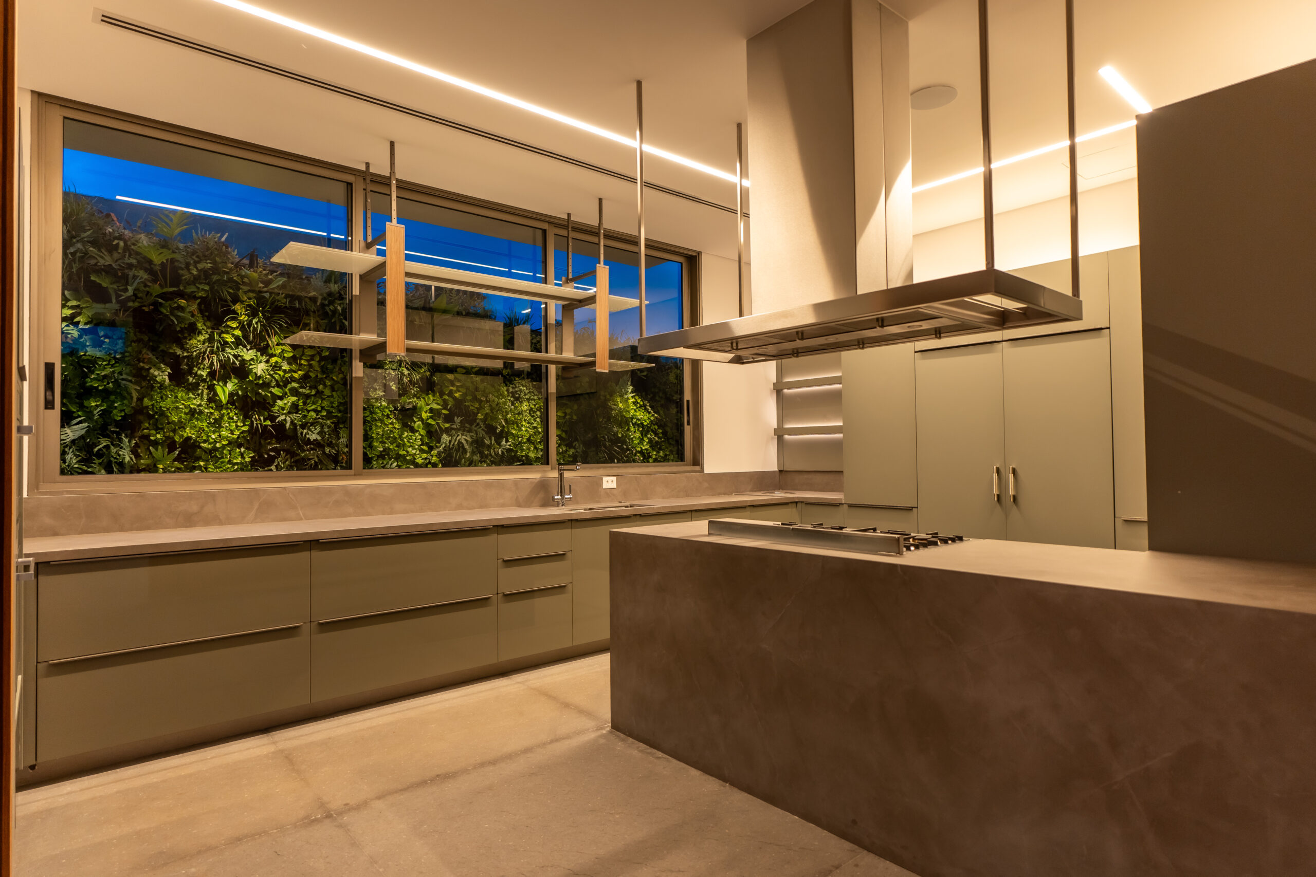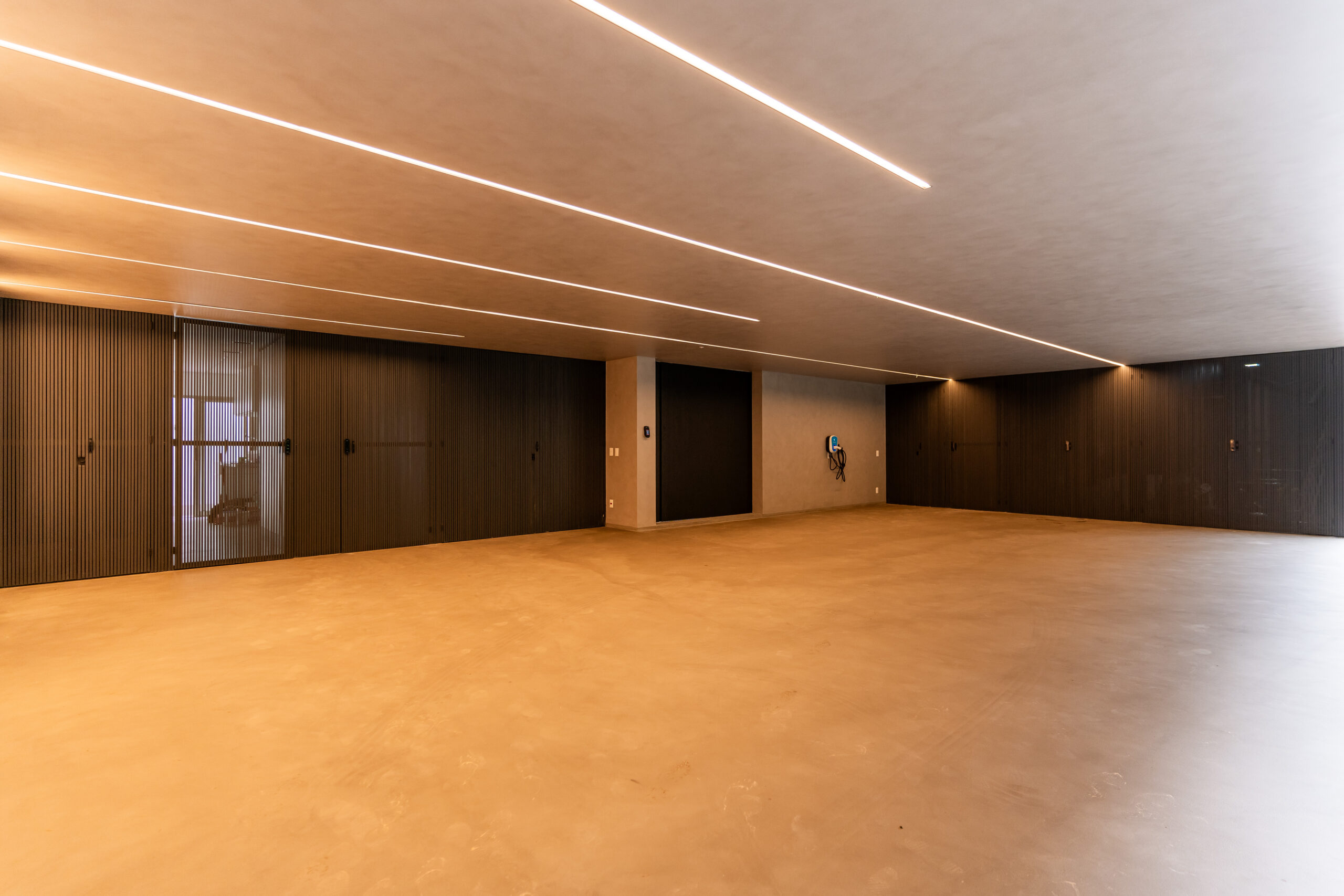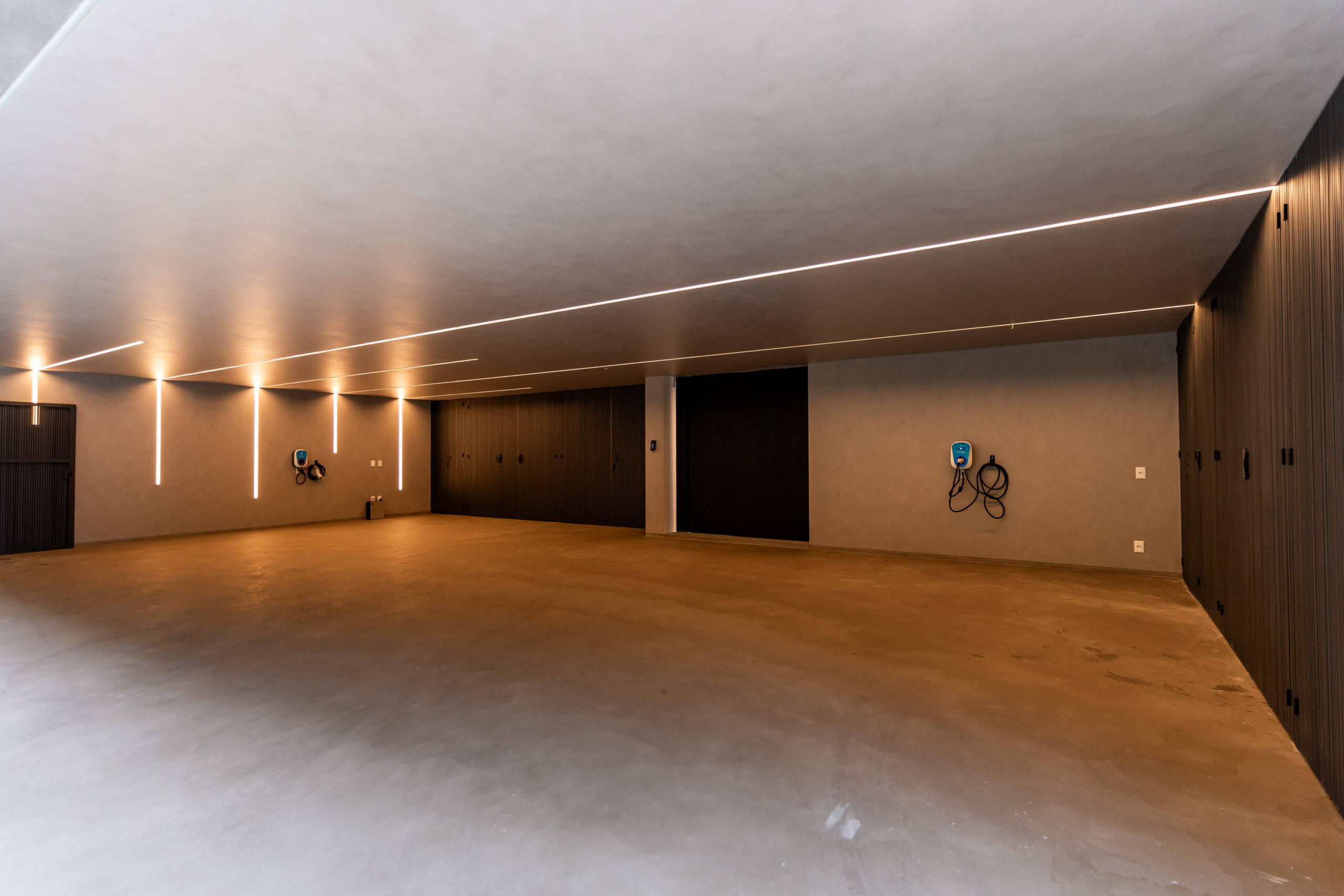 Garagem lounge com iluminação natural e muro verde idealizada para acomodar os carros da família, assim como possíveis carros de coleção. Na garagem encontram-se 2 pontos de abastecimento para carros elétricos. O local proporciona uma atmosfera favorável para festas e encontros devido a iluminação e acabamentos cuidadosamente escolhidos e executados. Painéis de serralheria com mood industrial dissimulam variados e amplos espaços de depósitos de bicicletas e afins.