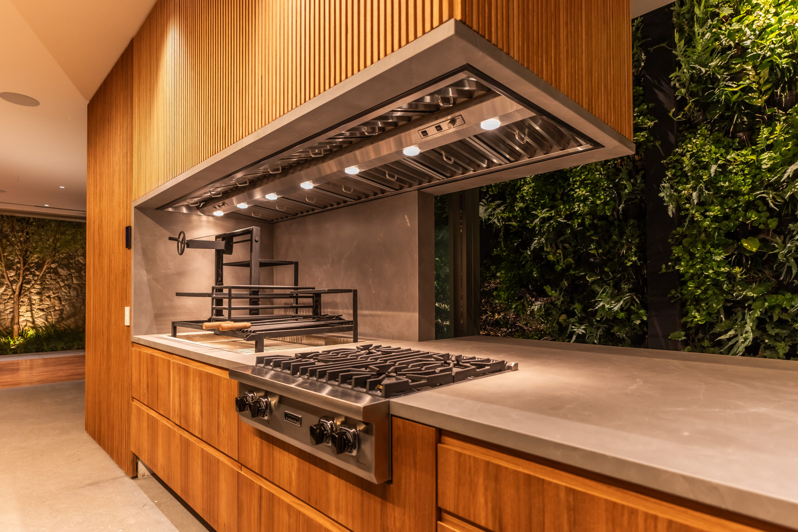 Equipamentos e suportes (bancadas e afins) que proporcionam o preparo de qualquer especialidade gastronômica desejada. A ilha e a espaçosa bancada são feitas em uma pedra nobre resistente aos desafios de um espaço de preparo.