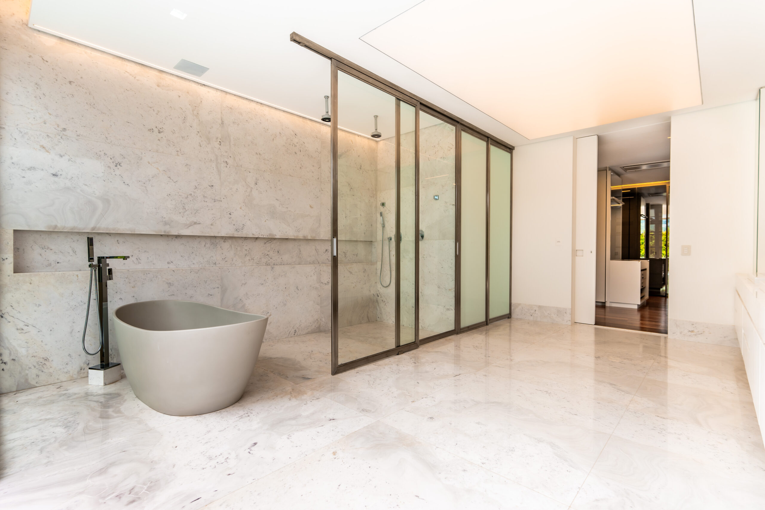 A suíte master ampla, com um enorme closet da ORNARE, com espaço senhor e senhora, maquiador, cofre, espaço comum para o casal. É um ponto alto da Casa somado ao banheiro com varanda e banheira escultural.